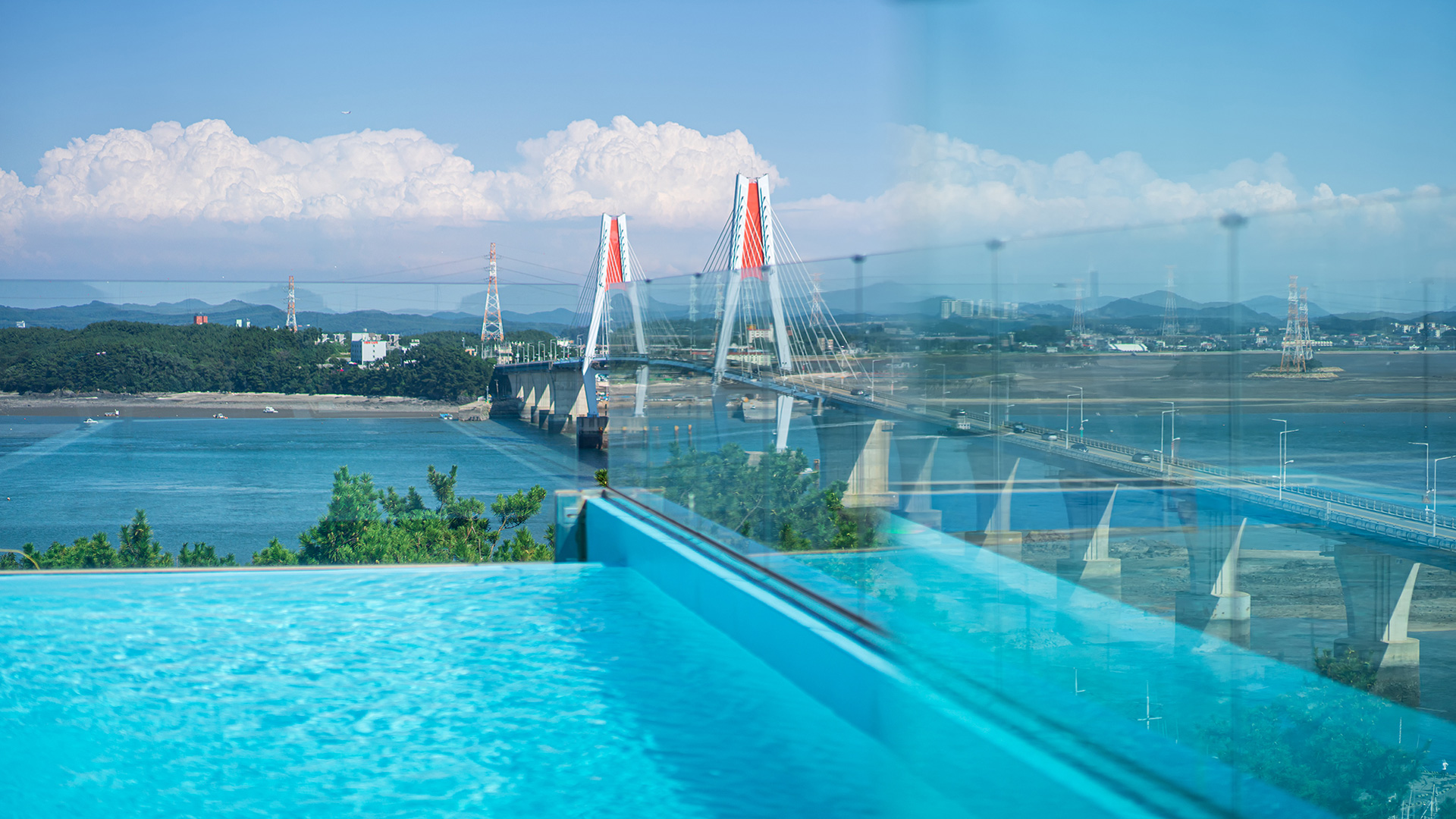 수평선과 맞닿아 있는 것처럼 보이는 루프탑 수영장에서